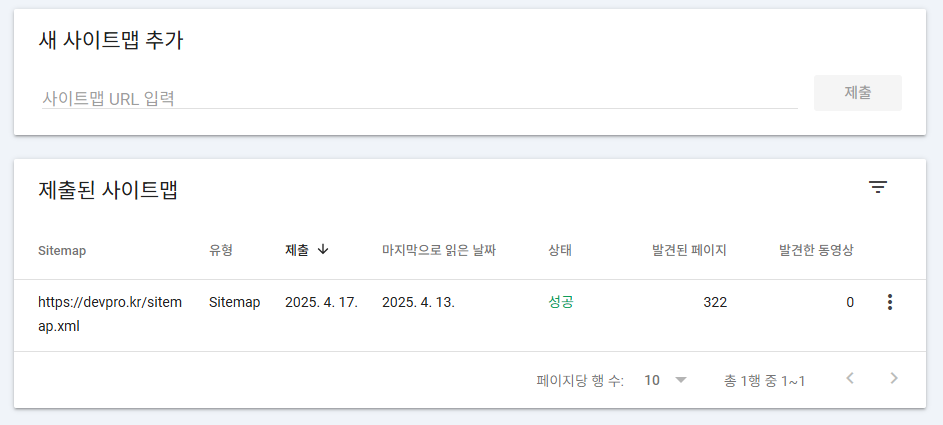 사이트맵이 성공적으로 등록되면 위와 같이 제출된 사이트맵 리스트에 성공 상태로 나타나게 됩니다.