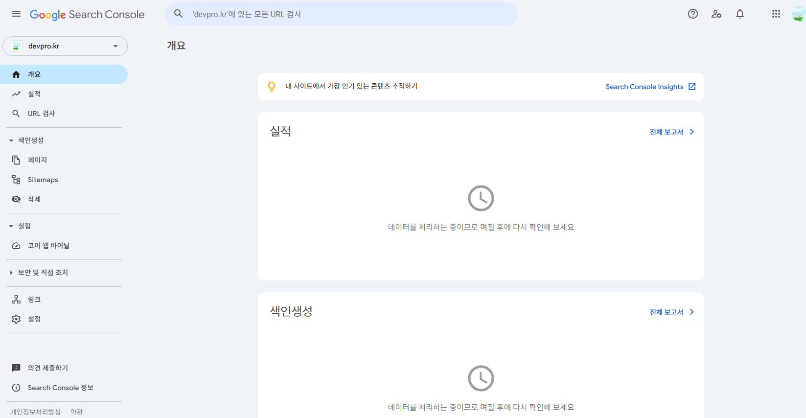 모든 인증이 끝나면 아래처럼 Google Search Console 대시보드에 접속할 수 있게 됩니다.