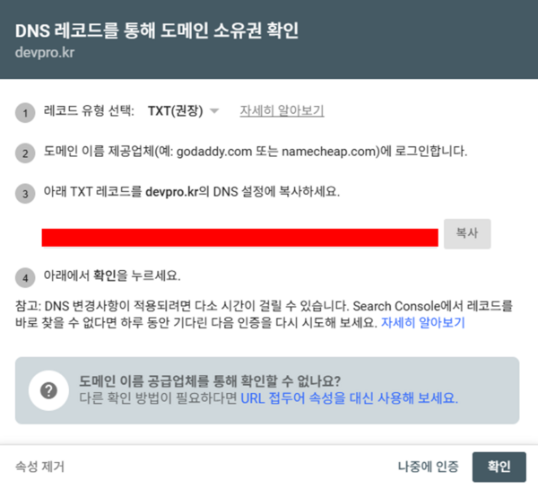 이제 DNS 레코드를 통해 도메인 소유권을 확인할 차례입니다.