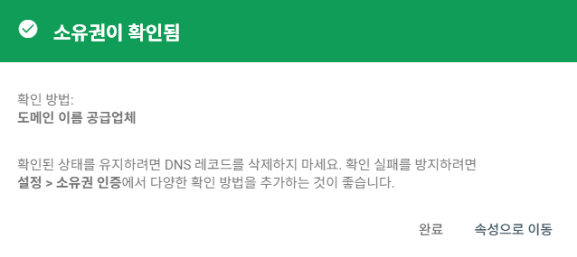 DNS를 올바르게 설정하였다면, 아래와 같이 소유권이 확인되었다는 메시지를 확인하실 수 있습니다.